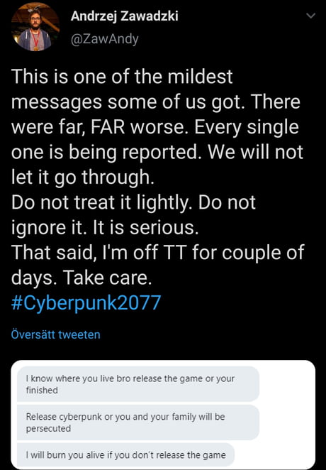 Nowadays, does anyone even care about your work if you're not receiving a death threat or two over it? San francisco, oct 30 : Cyberpunk 2077 devs receive death threats over latest delay cd projekt red's andrezej zawadzki unveiled a series of online death threats the company received following cyberpunk 2077's most recent delay. Cyberpunk 2077 game developers sent death threats after delay. Cyberpunk 2077 developer andrzej zawadzki has asked angry fans to stop sending him death threats after the game was delayed once again. Following cd projekt red's most recent delay for cyberpunk 2077, developers of the game have reportedly received death threats. However, cd projekt red's decision to delay cyberpunk 2077 for a third time caused some angry fans to. The latest delay is the third change to cyberpunk 2077's release date this year, having initially been. Cyberpunk 2077 developers ask for basic human decency after receiving death threats over game delay new, 69 comments 'we are people, just like you.' Not putting your feet in the developers' shoes isn't the best response to the news, but unfortunately, it isn't the worst, as there were those that sent death threats to the devs just because of the delays. Cyberpunk 2077 developer decries death threats, reminds fans devs are people too cyberpunk 2077 lead game designer andrzej zawadzki took to twitter to remind people that death threats are not cool. This gives the team a little extra time to work on. The studio has now responded to the death threats that employees have received over the internet.